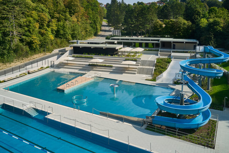 Eingebettet zwischen Donauufer und Waldrand liegt das Sigmaringer Freibad in schöner Hanglage am Ortsrand. Um die Anlage aus den 1960er Jahren zukunftsfähig zu gestalten, wurden Bestandsgebäude und Technik auf den aktuellen Stand gebracht und gestalterisch aufgewertet.
