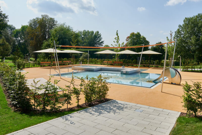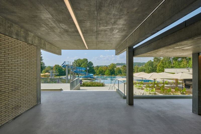 Im Laufe der Jahre wurde das Freibad immer wieder umgestaltet, die klare Grundstruktur der Sichtbetonkonstruktion blieb jedoch bis zum Zeitpunkt des Umbaus deutlich sichtbar. Sie prägt den Charakter der Anlage maßgeblich. Das neue Konzept bindet die markanten Sichtbetondächer und Wände aus Sichtmauerwerk in die Gestaltung ein. Durch die Hanglage erstreckt sich das Gebäude mit Umkleiden, sanitären Anlagen, Gastronomie und Nebenräumen über drei Ebenen. Besondere Aufenthaltsqualität bieten die weitläufigen Sitz- und Liegestufen aus Sichtbeton, die Gebäude und Badeebene miteinander verbinden. Die Sanierung umfasste ebenfalls die Erneuerung der Becken und Beckenumgänge. Ein attraktives Holzdeck im Becken und weitere Attraktionen werten das Nichtschwimmer- und Freizeitbecken auf. Die neue Sprunganlage mit Sprungbecken, eine neue Breitwellenrutsche und die 80-Meter- Wasserrutschbahn aus dem Bestand sorgen für Badespaß. Hinzu kommt ein neu gestalteter Kinderbereich, der zwei Becken mit unterschiedlichen Wasserzonen und -tiefen umfasst.